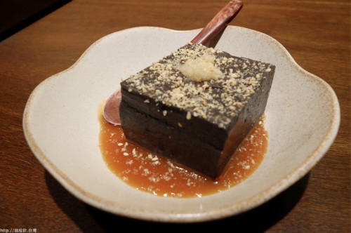 我點了兩道小菜,分別是胡麻豆腐與味噌野菜捲。胡麻豆腐看起來像是一塊不太新鮮的豬血糕似的(原諒我的措詞),但是卻是香純滑嫩,嘴裡可以感受到隱隱的胡麻幽香,同時伴隨著甜味噌與薑泥的辛刺。